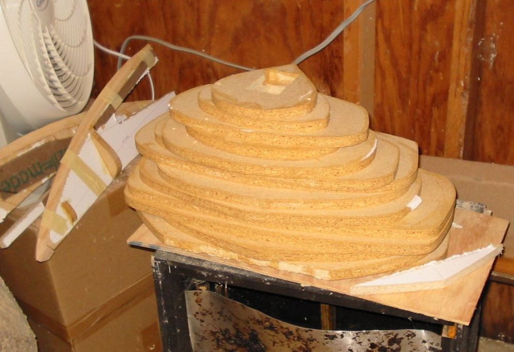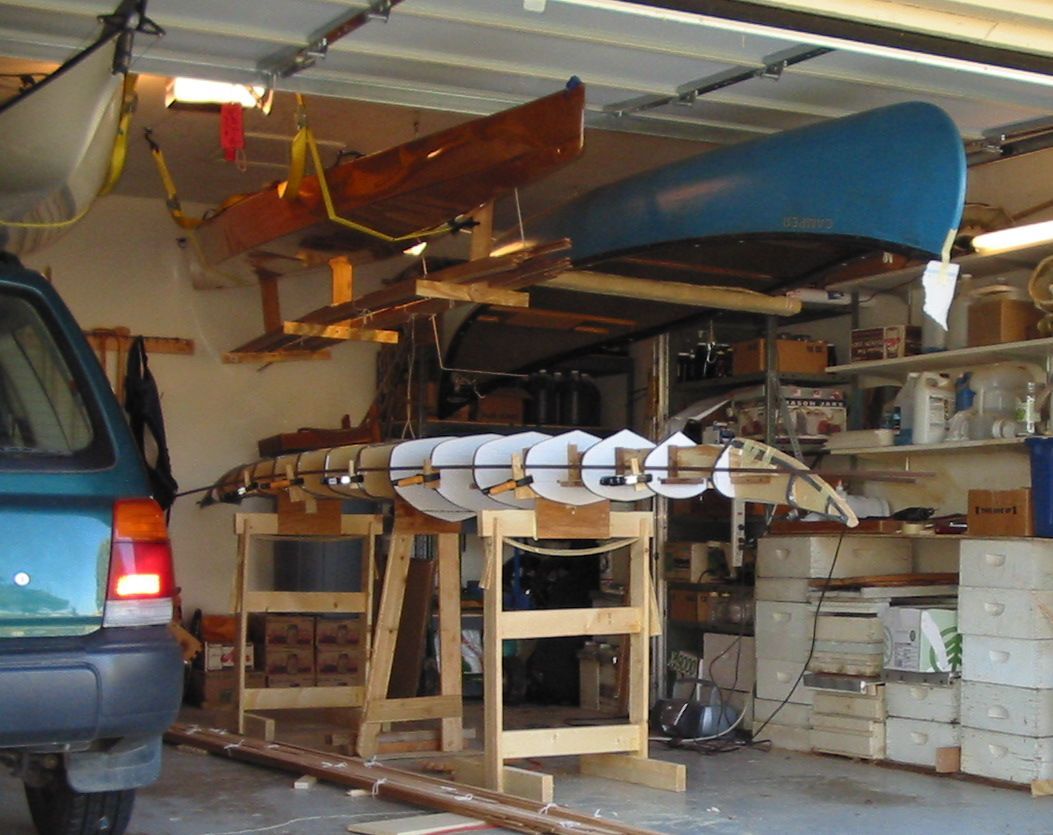 basically it. This might be a good time to mention that I'm building this boat in my garage. My HALF of the garage. My usual workshop is a converted garden shed that is too small for a 17' kayak, so I'll be parking in the driveway until this thing is completed. I met a lot of curious neighbors when I built my first kayak, as I prefer to work with the garage door open unless the weather is a problem. I've improved the lighting with 4' fluorescent lights and have a radio and CD player for company. My work table is an 8' by 2' plywood sheet placed on top of some bee hive boxes.