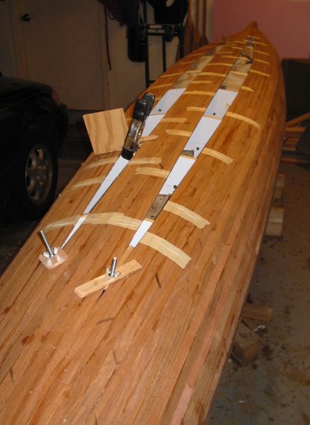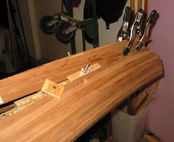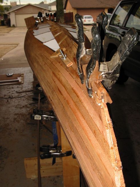 The wood for my boat was cut from decking lumber I bought from Home Depot. Most of the boards were 2" x 8" by 12 feet long. I cut strips from six boards, but the boat only used four of the best ones.