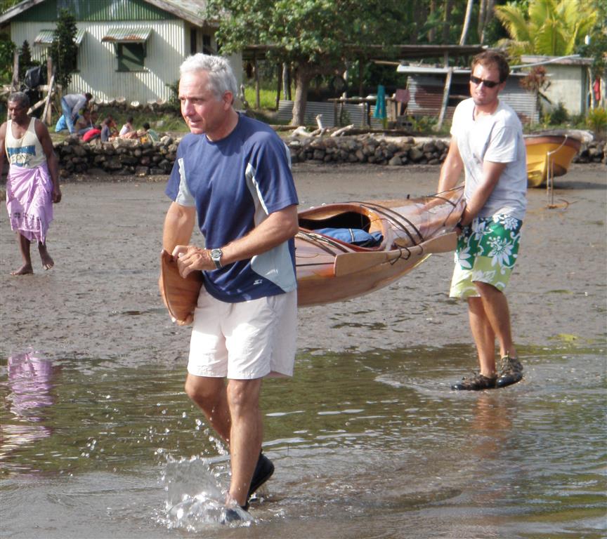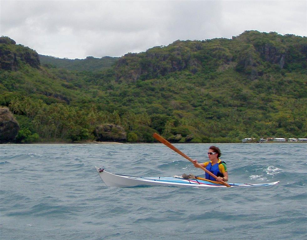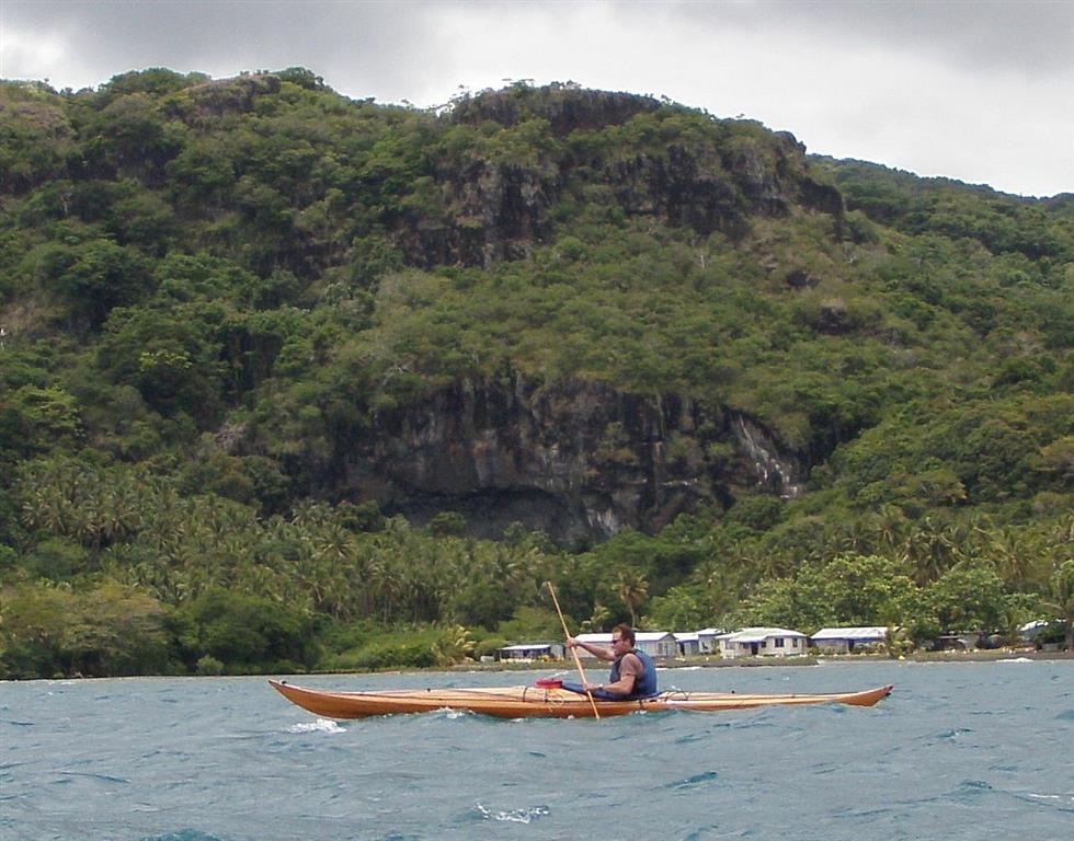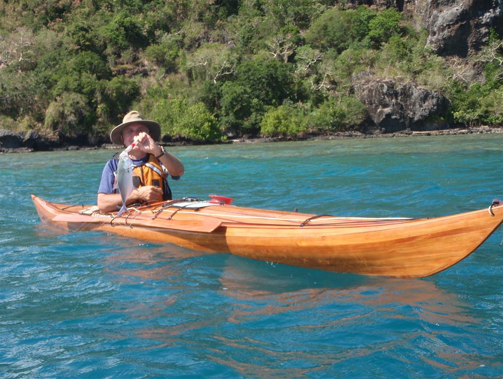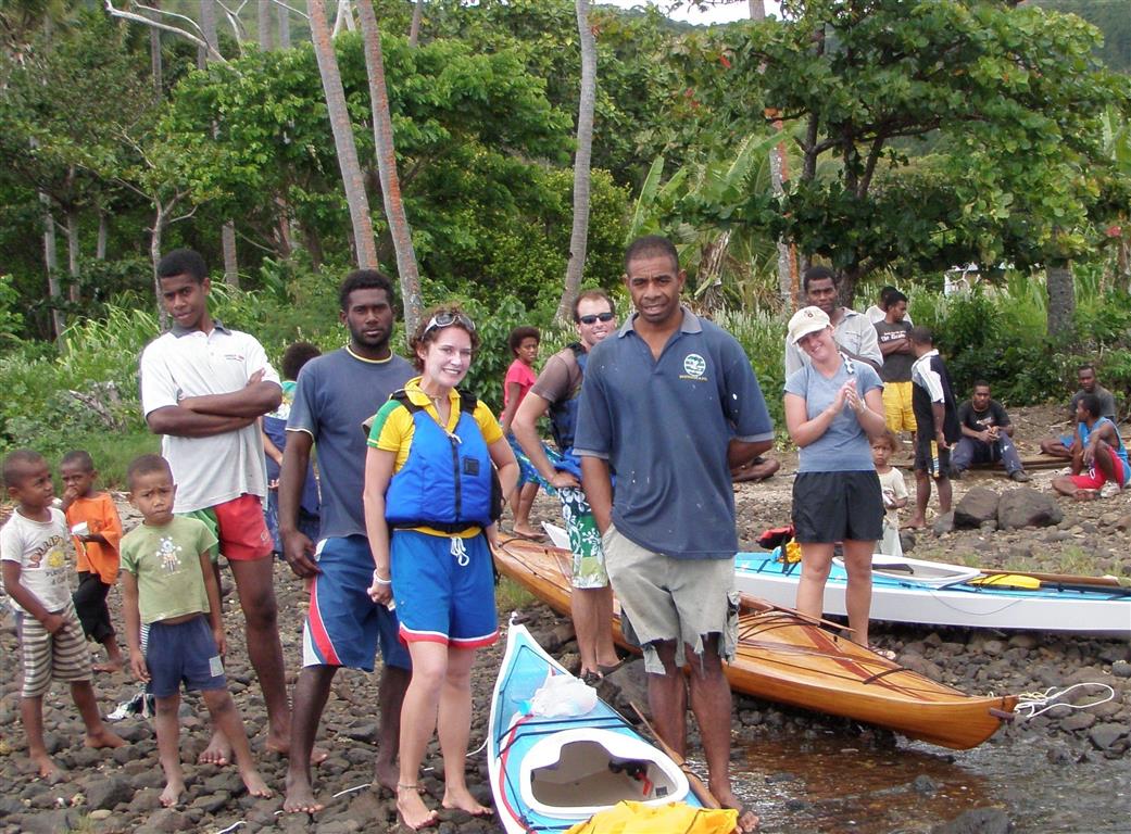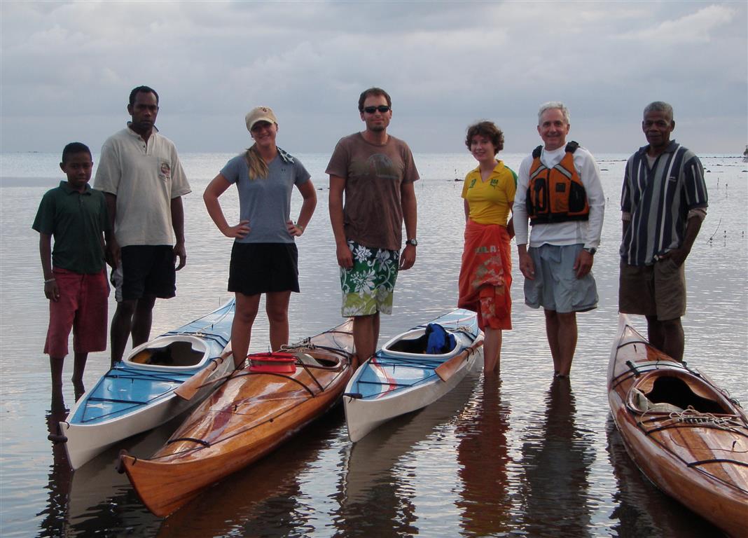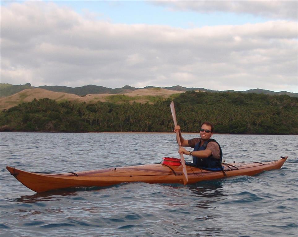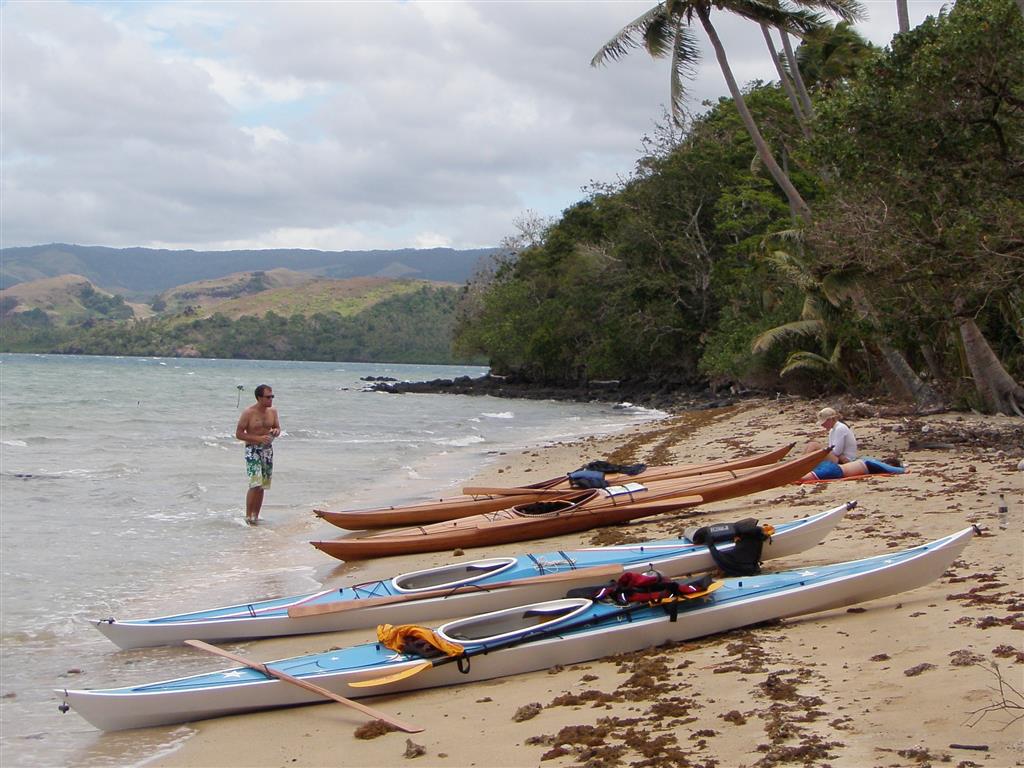 Our trip started at Namuaimada village in Ra, with our first overnight stop at Veidrala village. |  Our kayaks were all between 5.2 and 5.5 meters (17-18') long and 570mm (22.5:) wide. Two were stitch and glue boats, one named 'Stars' and the other 'Stripes'. |  The other two boats were wood strip built from Dakua. It is similar to Basswood. We mostly used Greenland paddles, with Euro paddles as backup. Choney has his trolling rig on deck in thsi shot. |