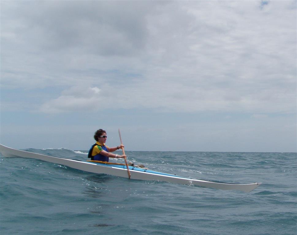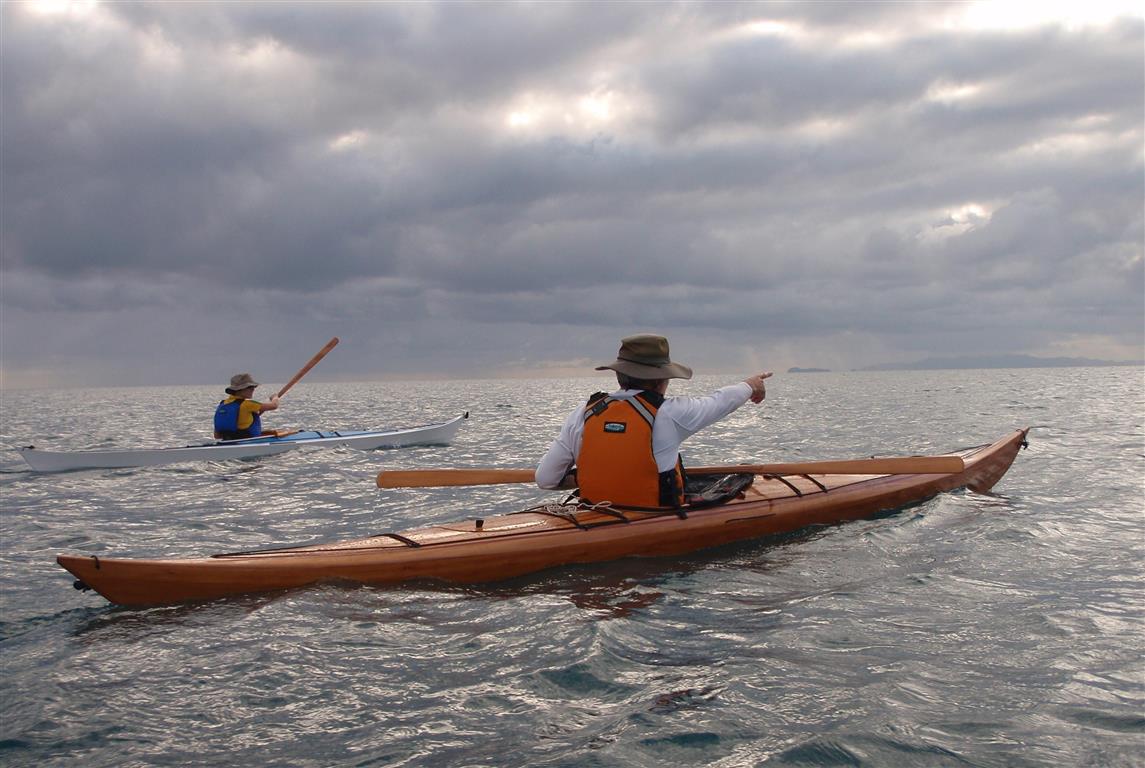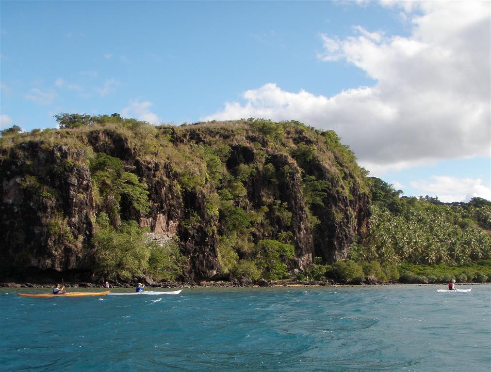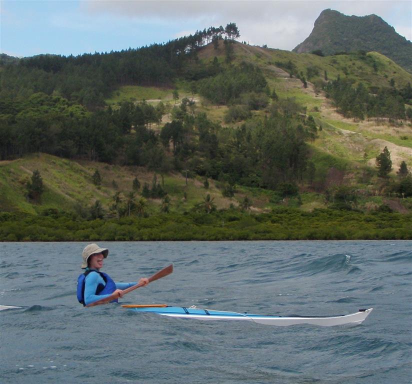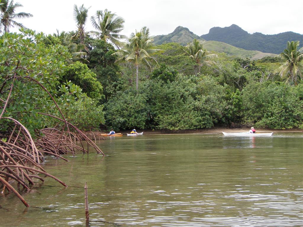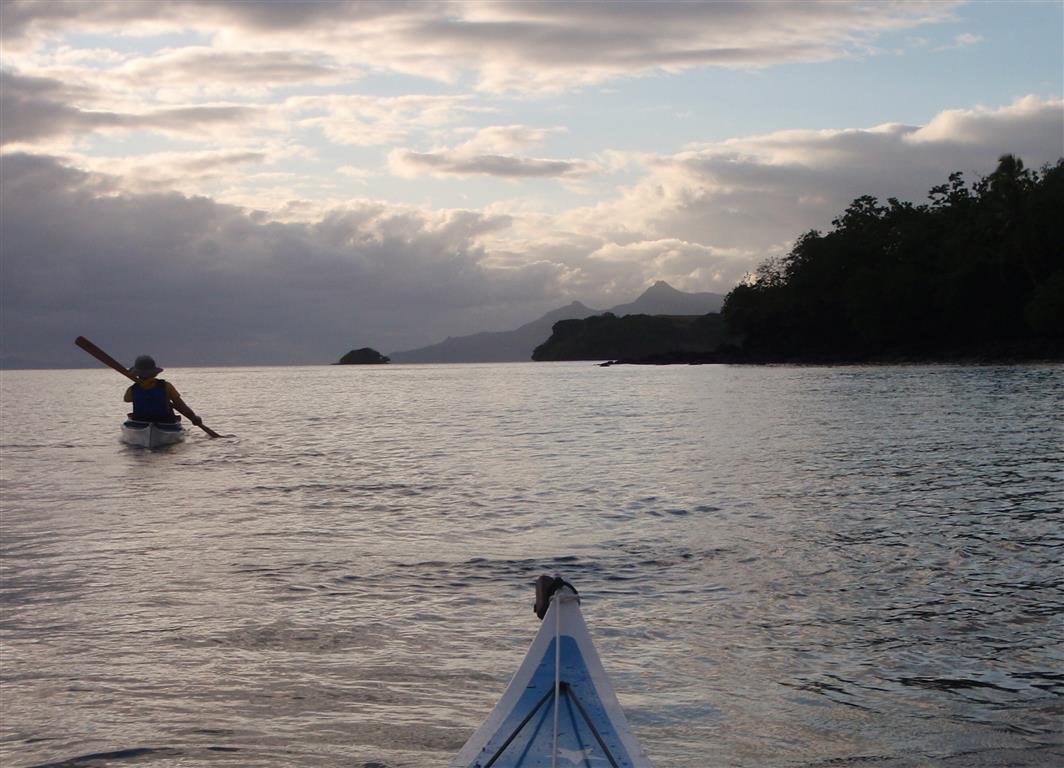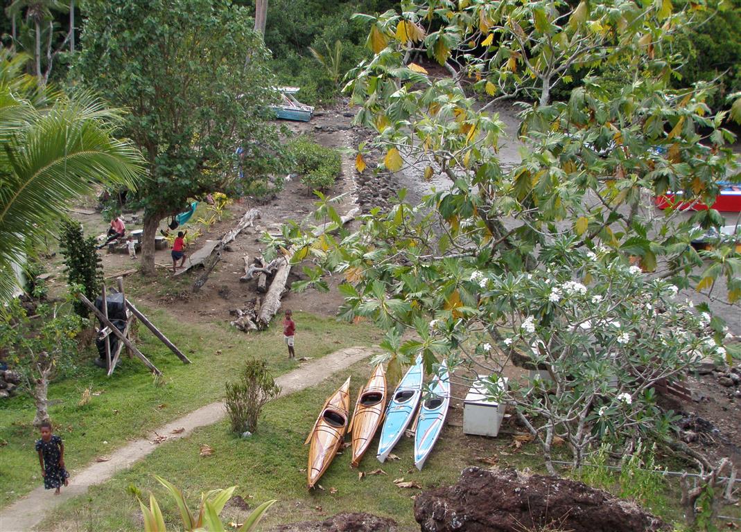 Our trip started at Namuaimada village in Ra, with our first overnight stop at Veidrala village. |  Our kayaks were all between 5.2 and 5.5 meters (17-18') long and 570mm (22.5:) wide. Two were stitch and glue boats, one named 'Stars' and the other 'Stripes'. |  The other two boats were wood strip built from Dakua. It is similar to Basswood. We mostly used Greenland paddles, with Euro paddles as backup. Choney has his trolling rig on deck in thsi shot. |
