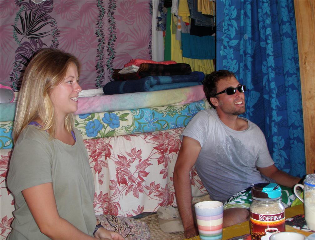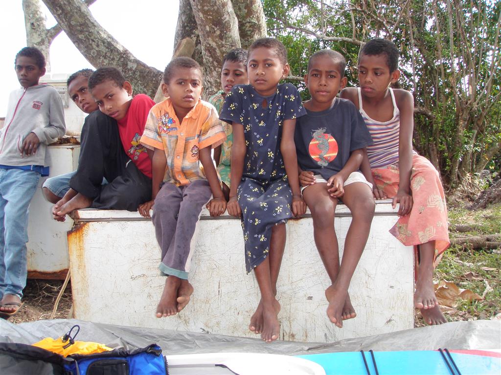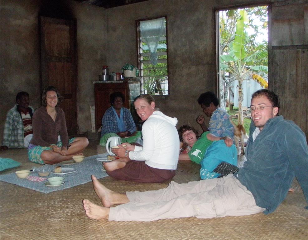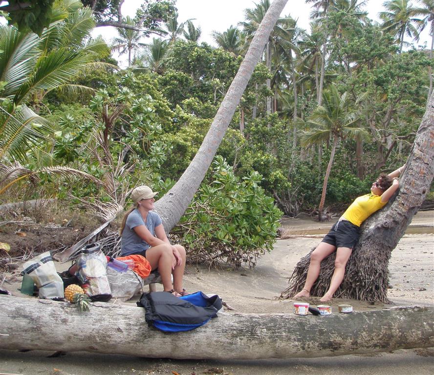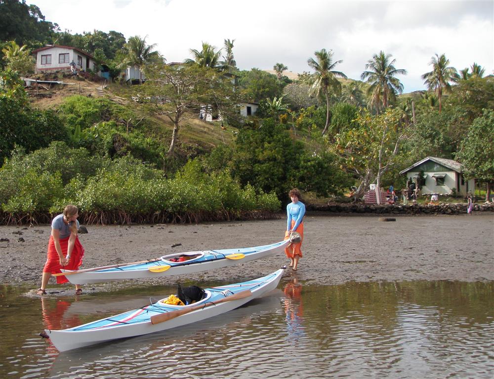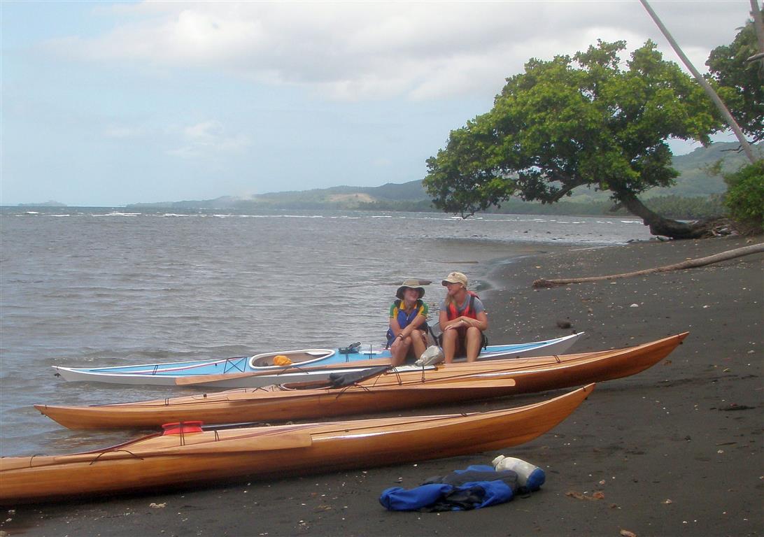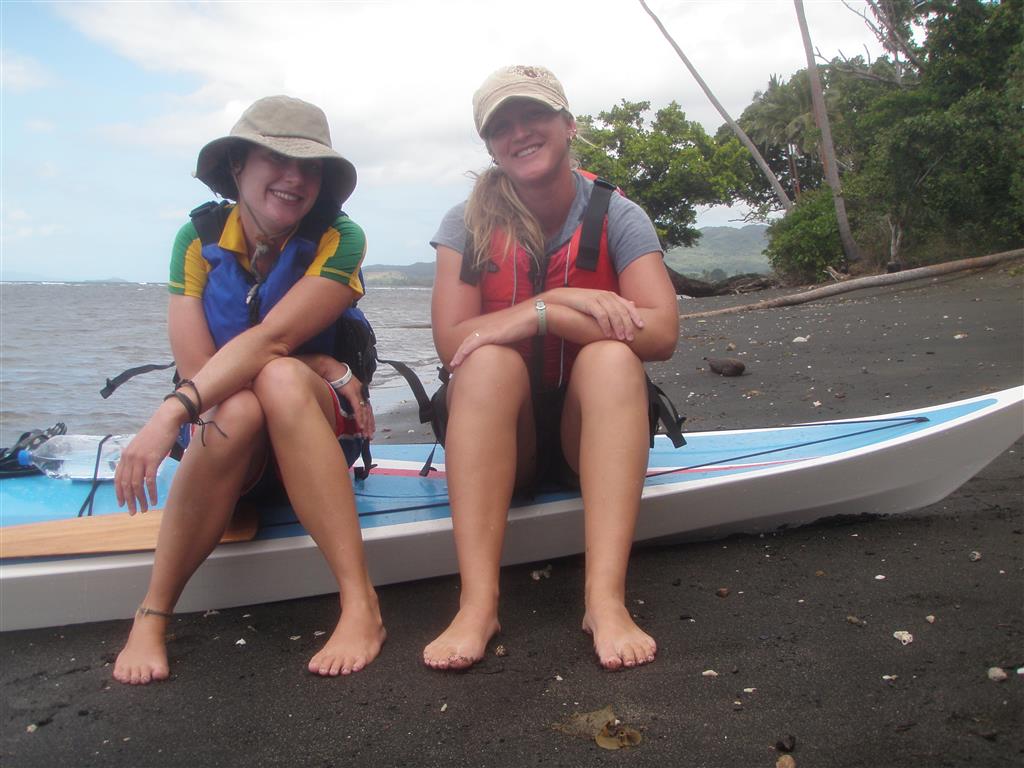 A black sand beach, created by erosion of old lava flows. |  Tow happy but exhausted paddlers. |  After a 25 km paddle, we stayed our second night at Dawasamu village, in Tailevu. A Peace Corps volunteer friend allowed us to stay at her house. |