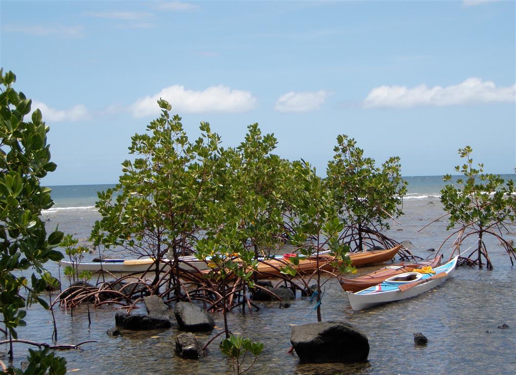 White sand beach. |  No beach at this rest stop. We tethered our kayaks to the mangroves and sat on some rocks. |  We had wind a few days, and caught some good surfing waves. |